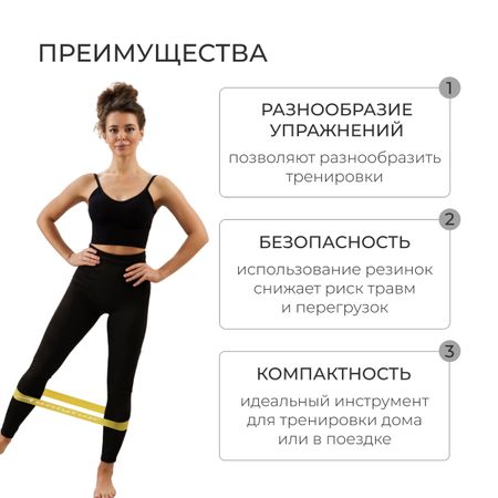 Набор фитнес-резинок ONLYTOP: нагрузка 10, 15, 20, 25, 30 кг, 5 шт., 30×5 см. Фитнес — резинки это многофункциональные эспандеры для развития и поддержания тонуса мышц бедер, ягодиц, груди и плечевого пояса. Подойдут для упражнений: приставные шаги, махи и выпады. Возможно использование в качестве грудного эспандера. Подойдут для увеличения интенсивности тренировок как любителям, так и профессионалам. Нагрузка: <ul> <li> 30 x 5 x 1,1 = 10 кг желтый</li> <li> 30 x 5 x 1,2 = 15 кг оранжевый</li> <li> 30 x 5 x 1,3 = 20 кг красный</li> <li> 30 x 5 x 1,4 = 25 кг фиолетовый</li> <li> 30 x 5 x 1,5 = 30 кг черный</li> </ul> Размер резинок в обхвате: 60 см.