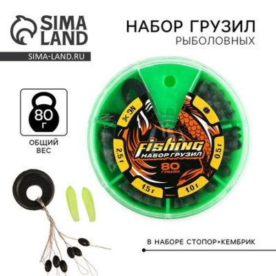 Набор рыболовных грузил 80 г, стопор 1 шт. и кембрики 1 шт., d=7 смПрактически любая ловля рыбы подразумевает использование грузил. Грузилом пользуются во время охоты на рыбу с целью выровнять поплавок, а также для достижения крючком с приманкой конкретной глубины. Грузила в форме дроби считаются наиболее популярным в настоящее время.В набор входит:- грузила для рыбалки (67 шт) весом 0,3 гр, 0,5 гр, 1 гр, 1,5 гр, 2,5 гр.;- стопор — 1 шт;- кембрики — 2 шт.