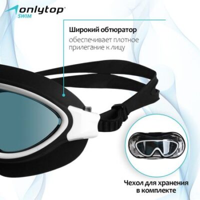 Очки-полумаска для плавания ONLYTOP. Очки-полумаска предназначены для плавания в бассейне или открытом водоеме. Широкий уплотнитель прилегает к лицу и исключает затекание воды внутрь. Крепежный ремешок плотно прилегает к голове и легко регулируется. Монолинза обеспечивает широкий угол обзора. Очки имеют покрытие, которое препятствует запотеванию и защищает от воздействия UV-излучения. В комплект входит чехол для хранения.