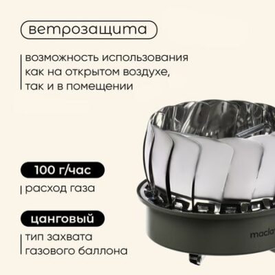 Плита газовая портативная maclay, для кемпинга, с ветрозащитой, 17×13 см, большая, круглая. Газовая плита с лепестковой ветрозащитой предназначена для приготовления пищи или кипячения воды в походных условиях. Работает от портативного газового баллончика. Для хранения и транспортировки убирайте изделие в специальный чехол. Он убережет устройство от повреждений и загрязнения. <b> Особенности</b> <ul> <li> Лепестки защитного экрана сохраняют ровное пламя даже при сильных порывах ветра.</li> <li> Устройство подходит для различных целей благодаря регулировке пламени.</li> <li> Пьезоподжиг позволяет разжечь огонь без зажигалки.</li> <li> Устройство имеет небольшой размер.</li> <li> Комплектуется чехлом для переноски.</li> </ul> <b> Характеристики</b> <ul> <li> Диаметр: 26 см.</li> <li> Высота: 14 см.</li> <li> Максимальная нагрузка: до 5 кг.</li> <li> Расход газа: до 100 г/час.</li> <li> Мощность: 2 кВт.</li> <li> Температура горения: 500 °С.</li> <li> Цанговое крепление баллона (баллон в комплект не входит).</li> </ul>