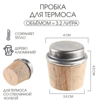 Пробка для термоса на 3.2 л, из дерева, 3.5 x 4 x 4.2 см. <b> Экологичная пробка для термоса 3.2 л</b> – это универсальное и практичное решение для хранения ваших любимых напитков. <b> Особенности конусных пробок:</b> <li> Благодаря своей гибкости, эти пробки легко входят в горлышко емкости, обеспечивая герметичное закрытие</li> <li> Вставляются в горлышко вручную, без необходимости использования специальных укупоривателей</li> <li> Изготовлены из дерева и металла, что делает их безопасными для контакта с пищевыми продуктами и напитками</li> Пробка для термоса может стать отличным дополнением к вашему термосу, сохраняя тепло напитков на долгое время.