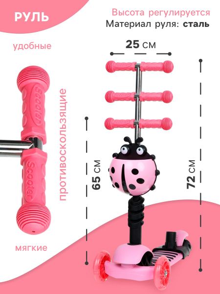 Самокат 5 в 1 GRAFFITI, колеса световые PU 120/80 мм. Самокат предназначен для детей от 3 лет. Подходит для последовательного обучения ребенка навыкам балансировки и равновесия. Колеса изготовлены из полиуретана, что повышает стойкость к коррозии и износу, имеют высокие показатели грузоподъемности и их невозможно проколоть. Во время движения колеса светятся. Дека изготовлена из пластика — это повышает уровень долговечности и устойчивости к влаге. При установленном сиденье – это беговел, благодаря такой функции ребенок развивает навыки координации и укрепляет мышцы ног. Если сиденье снято – это полноценный самокат, который позволяет прорабатывать мышцы верхних, нижних конечностей, мышц спины и брюшной полости. Комплектация <ul> <li> Регулируемый руль: 65-75 см</li> <li> Родительская ручка</li> <li> Съемное сиденье: спинка крепится на родительскую ручку</li> <li> Световые колеса</li> <li> Корзинка</li> </ul> Характеристики <ul> <li> Количество колес: 3</li> <li> Максимальная нагрузка: 40 кг</li> <li> Размер платформы: 26 х 14 см</li> <li> Ширина руля: 25 см</li> <li> Диаметр колеса: 120, 80 мм</li> </ul>