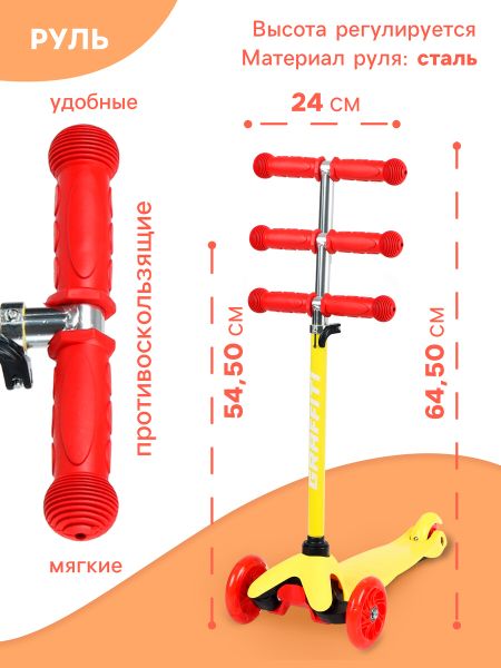 Самокат GRAFFITI, колеса световые PU 110/75 мм, ABEC 7. Самокат предназначен для детей от 3 лет. Подходит для обучения ребенка навыкам балансировки и равновесия. Колеса изготовлены из полиуретана, что повышает стойкость к коррозии и износу, имеют высокие показатели грузоподъемности и их невозможно проколоть. Во время движения колеса светятся. Дека изготовлена из пластика — это повышает уровень долговечности и устойчивости к влаге. Подшипник ABEC 7 подходит опытными райдерами, обладают высокой точностью вращения и влагозащитой. Характеристики <ul> <li> Количество колес: 3</li> <li> Высота руля: 54,5-64,5 см</li> <li> Максимальная нагрузка: 40 кг</li> <li> Размер платформы: 30 х 11 см</li> <li> Ширина руля: 24 см</li> <li> Диаметр колеса: 110, 75 мм</li> <li> Ножной тормоз</li> </ul>
