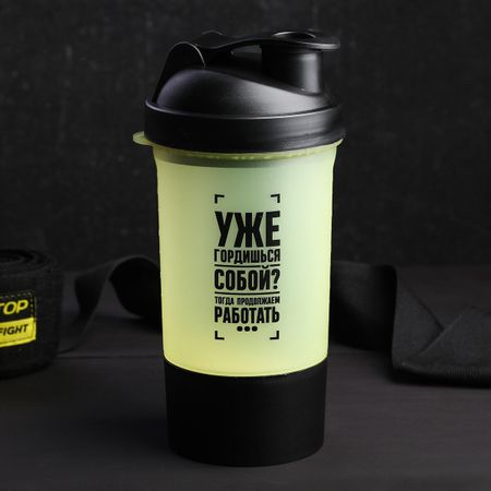 Шейкер спортивный для коктейлей и протеина «Уже гордишься собой?», 500 мл, с чашей. Представляем шейкер для воды объемом 500 мл от известной российской торговой марки Соломон. Этот продукт сочетает в себе стильный дизайн и высокую функциональность, идеально подходя для любителей спорта и активного образа жизни. Изготовленный из качественных и безопасных материалов, шейкер имеет сертификат РСТ, что подтверждает его надежность и соответствие стандартам качества. Одной из ключевых особенностей шейкера Соломон является съемная чаша для протеина, которая позволяет легко готовить и смешивать ваши любимые спортивные напитки. Удобная конструкция обеспечивает равномерное распределение порошков и предотвращает образование комков, что делает процесс приготовления максимально комфортным. Компактный и легкий, шейкер легко помещается в спортивную сумку или рюкзак, что делает его идеальным спутником для походов в тренажерный зал, занятий спортом на свежем воздухе или поездок. Элегантный и простой в использовании, шейкер Соломон станет вашим надежным помощником на пути к здоровью и отличной форме. Начните свой день с качественного белкового коктейля — выбирайте Соломон!