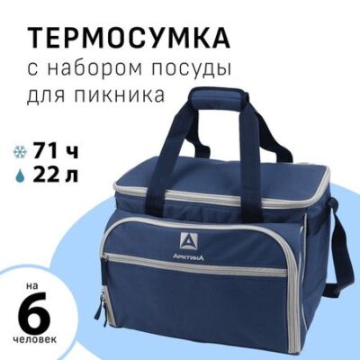 Незаменимый набор для организации пикника — сумка-холодильник и комплект стильной многоразовой посуды.Особенности:Изотермическое отделение покрыто внутри теплоизоляционным фольгированным слоем, который позволяет сохранить свежесть и прохладу напитков и еды до 75 часов.В отделении с посудой хранится комплект на 6 персон: 6 стаканов, 6 вилок, 6 ложек, 6 ножей, 6 тарелок, солонка-перечница, штопор и разделочная доска. Можно использовать как с набором посуды, так и без него.Есть наружный карман для хранения мелочей.Объем холодильного отсека — 22л.Дополнительно:Рекомендуется использовать вместе с аккумуляторами холода