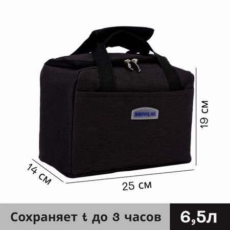 Термосумка на молнии 6.5 л, наружный карман, черная. Эта черная термосумка сохраняет температуру продуктов во время коротких поездок или прогулок. Компактная модель формата «сундучок» подходит для обедов на работе, пикников или перевозки детского питания. <b> Особенности модели</b> <ul> <li> Вместимость 6,5 литров подходит для стандартных контейнеров с едой и напитков.</li> <li> Наружный карман на молнии удобен для столовых приборов или салфеток.</li> <li> Текстильные стенки поддерживают температуру внутри основного отделения.</li> <li> Универсальный черный цвет скрывает следы использования.</li> <li> Компактные габариты 25×19×14 см помещаются в стандартные рюкзаки.</li> </ul> <b> В повседневном использовании</b> Сумка защищает продукты от перегрева или охлаждения по дороге на учебу или работу. Отдельный карман помогает организовать пространство — столовые приборы и мелкие предметы не потеряются среди контейнеров с едой.