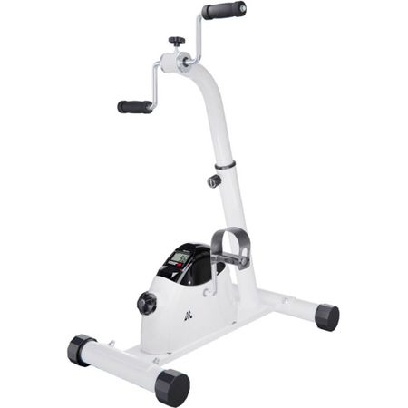 Велотренажер DFC B81802 — это домашний тренажер, который поможет вам поддерживать физическую форму и укрепить мышцы ног, ягодиц и пресса. Также тренировка на велотренажере способствует улучшению работы сердечно-сосудистой системы и повышению выносливости организма, а также бережёт суставы. Особенности Работа различных групп мышц Двойные педали для рук и ног позволяют разнообразить тренировку и задействовать больше групп мышцx Функциональность Педальный узел оснащен однокомпонентным шатуном, а система нагрузки — ременная. Вес маховика составляет 1 кг, инерционный вес — 2 кг. Велотренажер имеет бесступенчатую систему нагрузки, которую можно регулировать механически Консоль и дисплей Велотренажер оснащен простой и понятной консолью, для работы которой требуется всего одна батарейка ААА (входит в комплект). Дисплей отображает основные параметры тренировки: длительность, дистанцию, количество оборотов и количество потраченных калорий. Это позволяет контролировать процесс тренировки и следить за прогрессом Комфортное использование Тренажер рассчитан на пользователей весом до 110 кг. Благодаря компактной конструкции велотренажер не займет много места и будет удобен для хранения. Имеется регулировка высоты на 4 уровня с шагом 2,5 см для комфортного использования людьми разного роста Стабилизация Компенсаторы неровностей пола помогут установить тренажер на любую поверхность